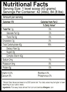 1 scoop (43 g) of Waxy Maize contains 170 calories, making it a great addition to anyone's diet who is looking for an easy way to increase their caloric intake.